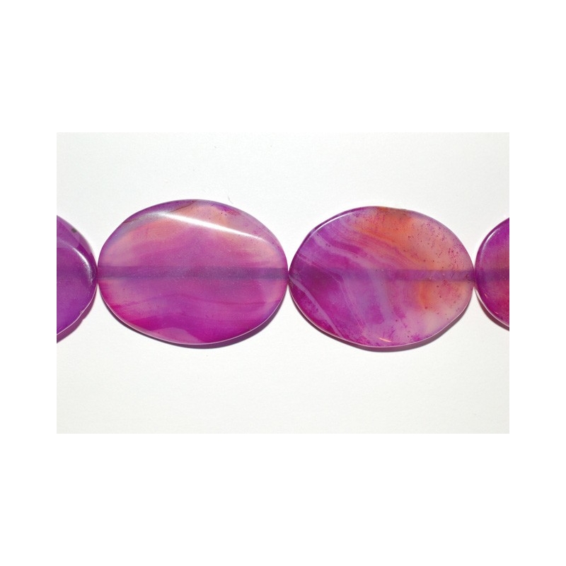 Flade ovale perler af agat. Str. på perler: ca. 30 x 40 x 7 mm. Hulstr.: ca. 2 mm. Antal på streng: 9 stk. Prisen er for 1 streng.