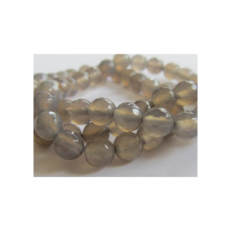 Facetslebne runde perler af grå agat. Str. på perler: ca. 6 mm. Hulstr.: ca. 1 mm. Antal på streng: ca. 64 stk. Prisen er for 1 streng.