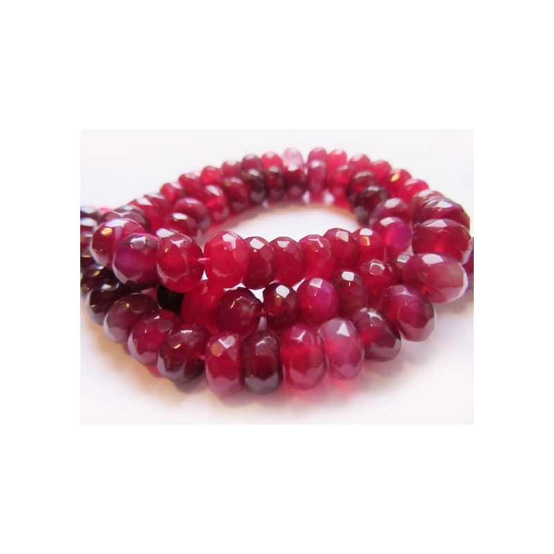 Facetslebne perler af rød agat - varierer i farven fra lys pink til mørkerød. Str. på perler: ca. 5 x 8 mm. Hulstr.: ca. 1 mm. Antal på streng: ca. 72 stk. Prisen er for 1 streng.