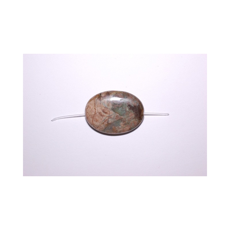 Flade ovale perler af aqua terra jasper. Str. på perler: ca. 25 x 35 x 8 mm. Hulstr.: ca. 1,5 mm. Prisen er for 1 stk.