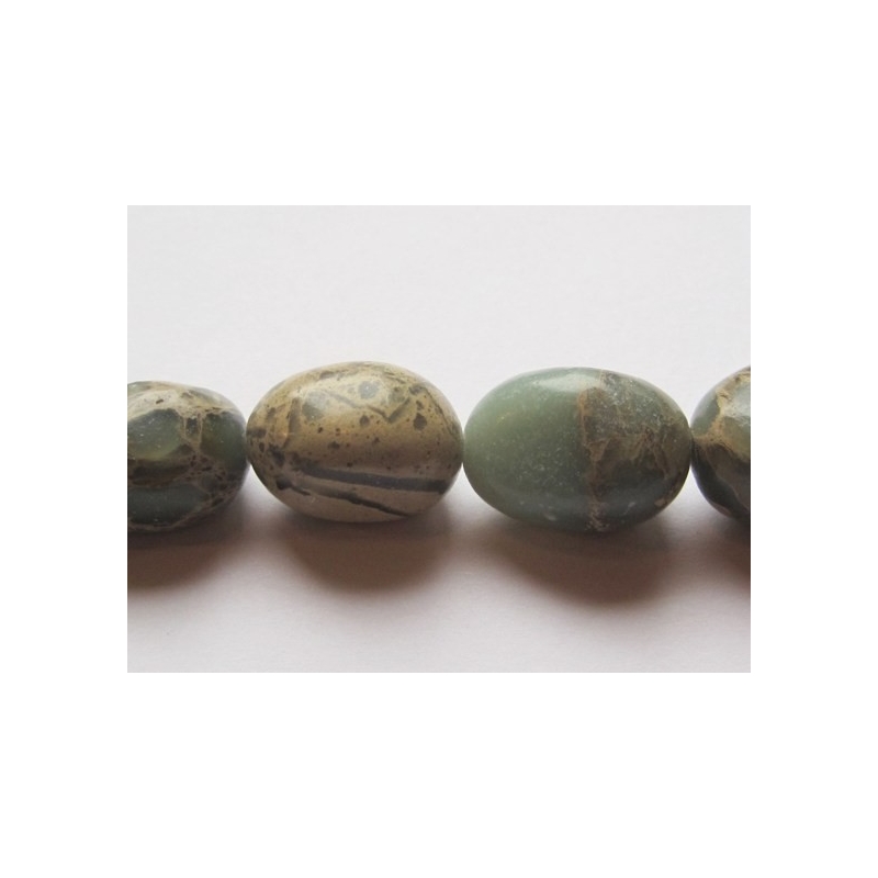 Flade ovale perler af aqua terra jasper. Str. på perler: ca. 25 x 35 x 8 mm. Hulstr.: ca. 1,5 mm. Prisen er for 1 stk.