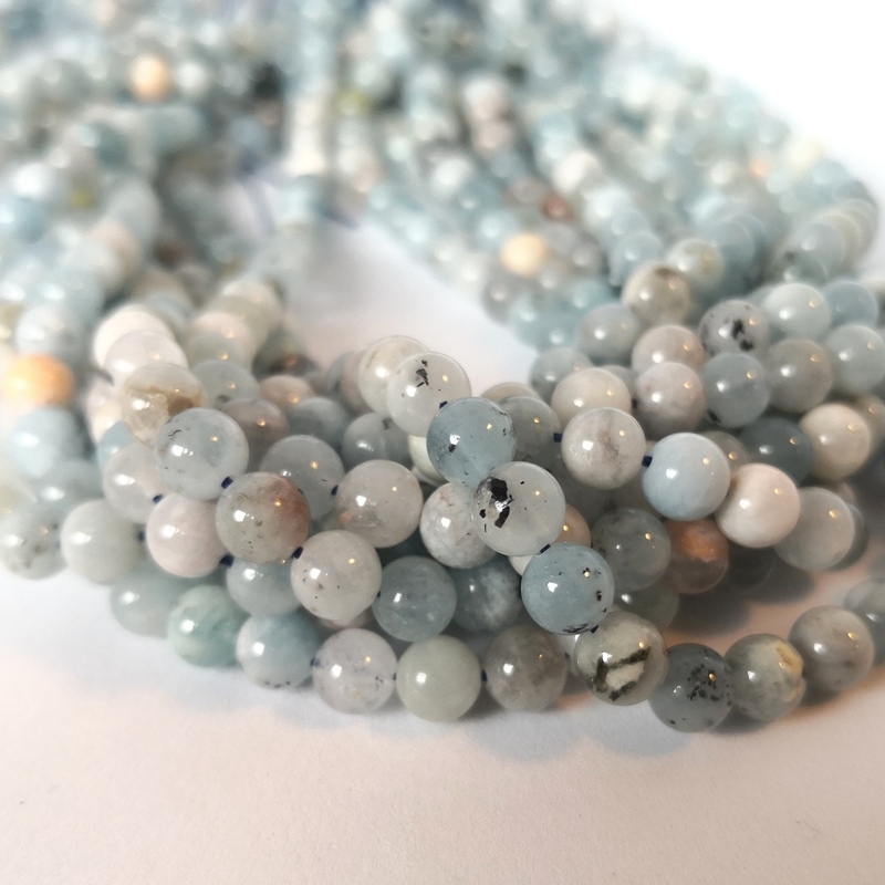 Runde perler af aquamarin. Str. ca. 6 mm. Hul str. ca. 0,8 mm. Antal på streng ca. 60 stk. Prisen er for 1 streng.