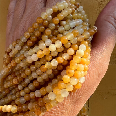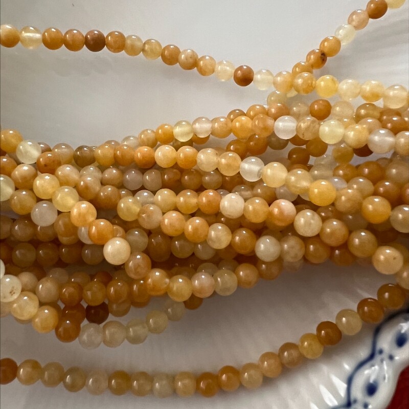 Facetslebne runde perler af aventurin i forskellige nuancer af orange. Str.: ca. 2 mm. Antal på streng: ca. 170 stk. Hul str.: ca. 0,5 mm. Prisen er for 1 streng.