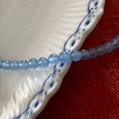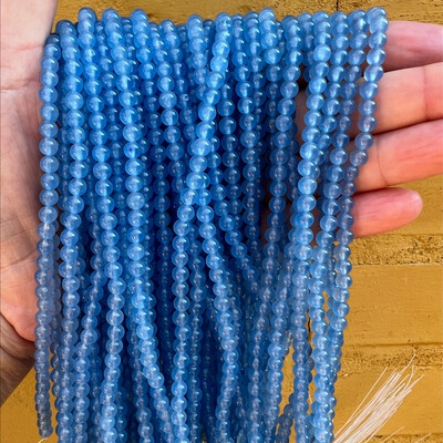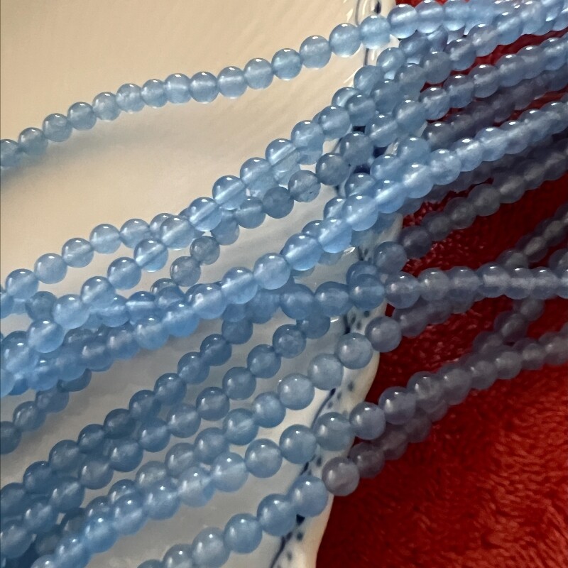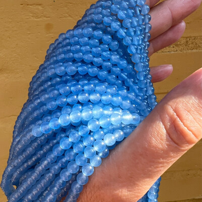 Runde perler af blå aventurin. Str.: ca. 10 mm. Antal på streng: ca. 40 stk. Prisen er for 1 streng.