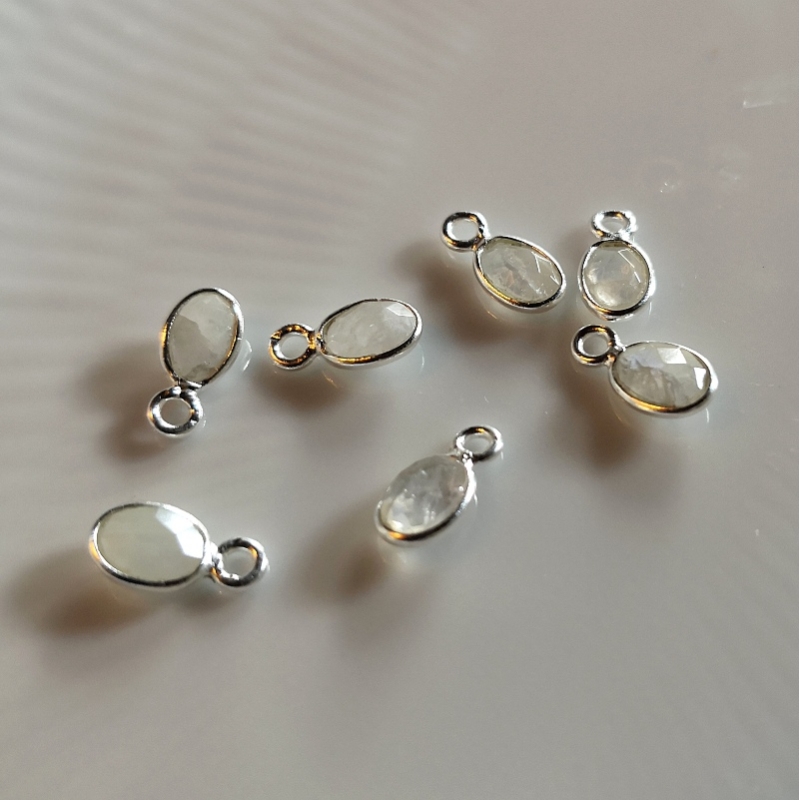Dråbe formet facetslebet bezel vedhæng - indisk håndlavet forgyldt sølvindfattet månesten - er ens på begge sider. Str. ca. 5 x 7 mm. (5 x 10 inkl. øje) Tykkelse - ca. 2 mm. Hul str. i øje ca. 1,5 mm. Prisen er for 1 stk.