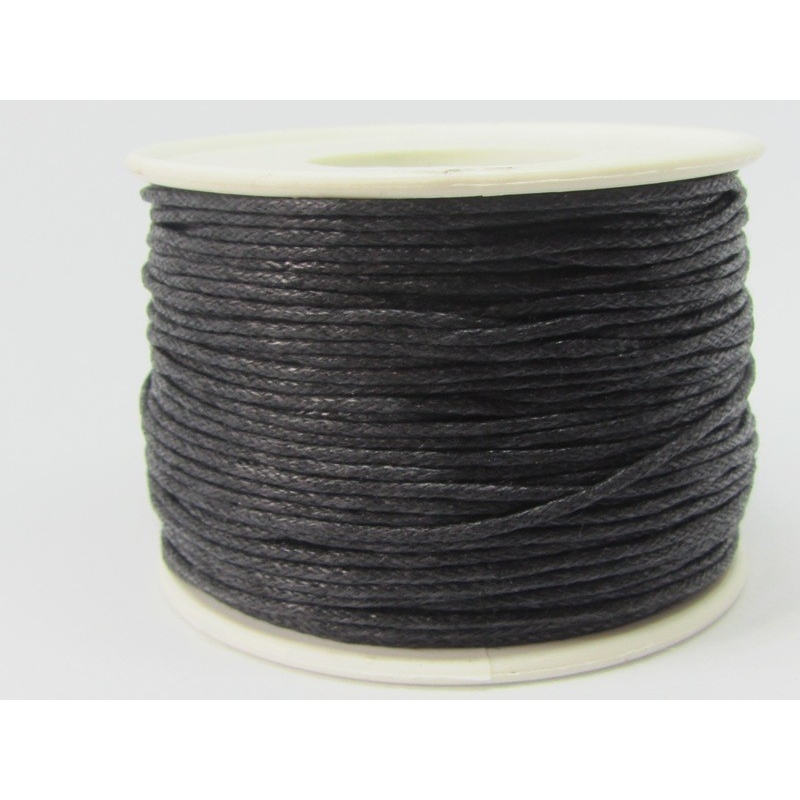 Vokset bomulds snor - sort. Tykkelse - ca. 1 mm. Prisen er for 1 rulle med ca. 90 meter.