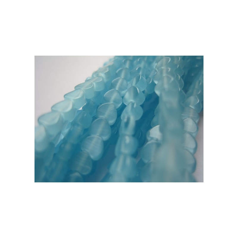 Hjerter af lyseblå cat eye perler. Str. på hjerter: ca. 3 x 3 x 2 mm. Hulstr.: ca. 0,6 mm. Antal på en streng: ca. 100 stk. Prisen er for 1 streng.