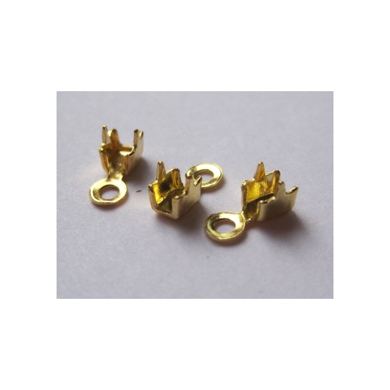 Endestykker til rhinstenskæde - guldfarvet. Str. ca. 5 x 5 mm. - passer til vores rhinestenskæde - 4 x 4 mm. Hul str. ca. 1 mm. Prisen er for 6 stk.