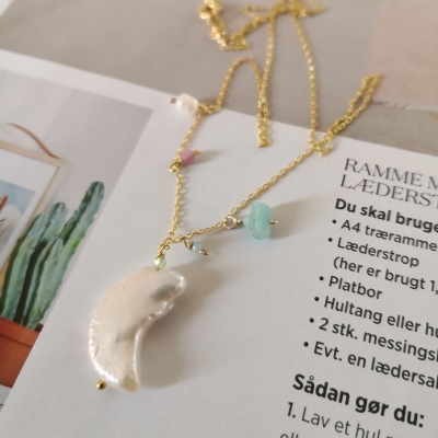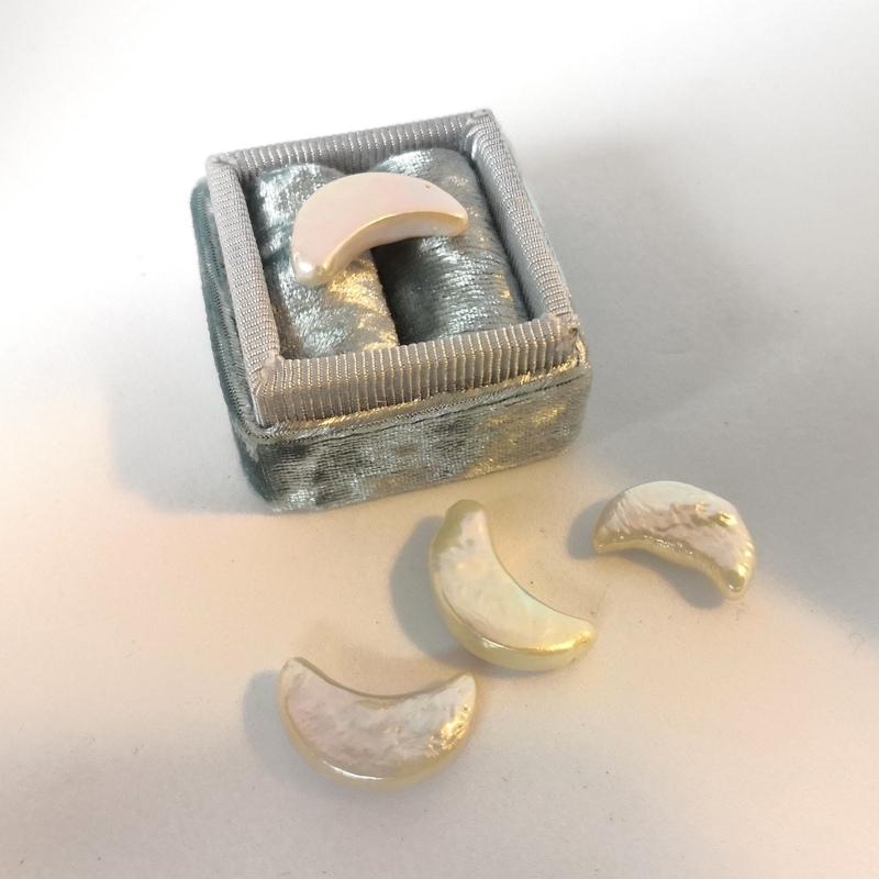 Halvmåne af ferskvandsperler. Str. ca. 13-14 x 4-5 mm. Hul str. ca. 0,8 mm. Antal på streng: ca. 20 stk. Prisen er for 1 streng.