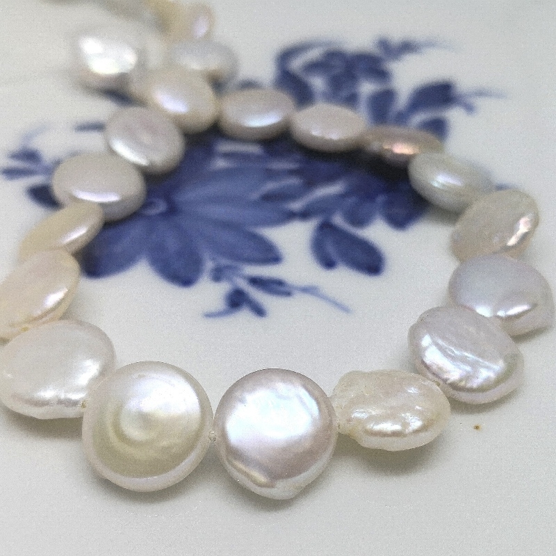 Barok, hvide ferskvandsperler - flade på en side. Str. ca. 9 x 11 mm. Hul str. ca. 0,7 mm. Antal på streng ca. 40. Prisen er for 1 streng.