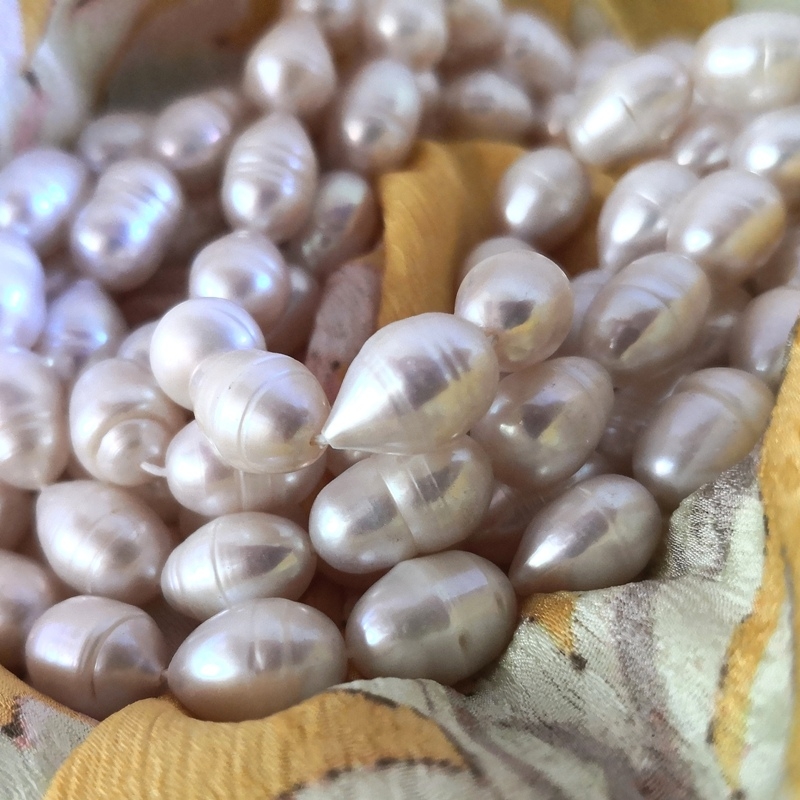 Barok, råhvide, aflange ujævne ferskvandsperler.