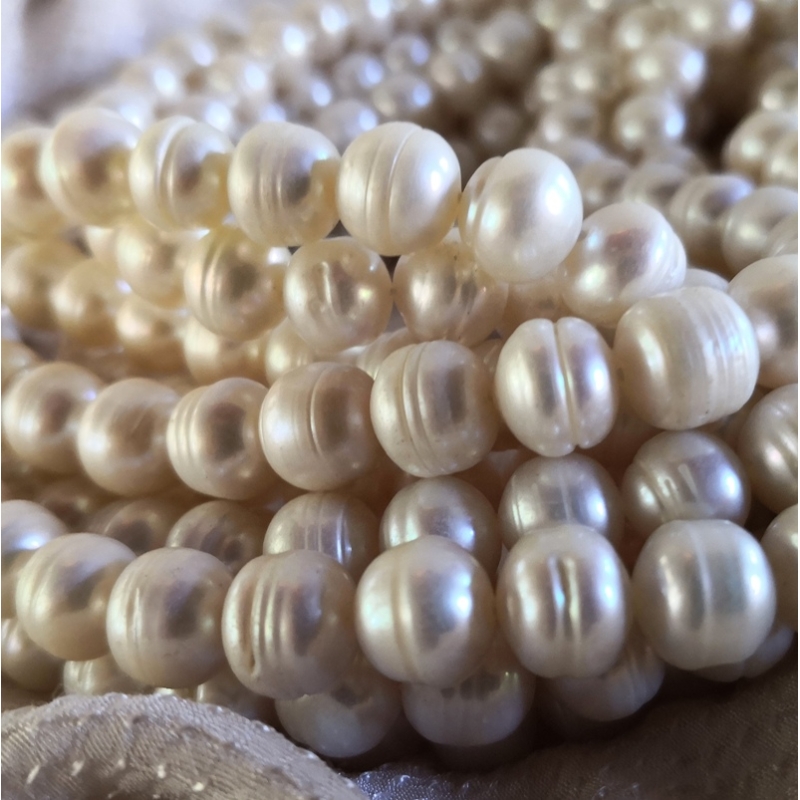 Hvide ferskvandsperler. Str. ca. 9-10 mm. Hul str. ca. 0,7 mm. Antal på streng ca. 42 stk. Prisen er for 1 streng.