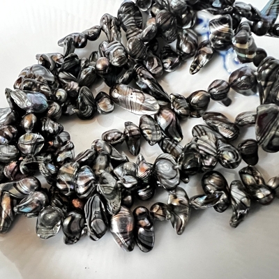 Tooth af barokke ferskvandsperler - zebra farvet. Str. ca. 6-8 x 9-16 mm. Hul str. ca. 0,6 mm. Antal på streng ca. 65 stk. Prisen er for 1 streng.