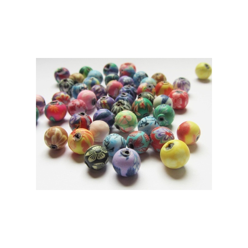 Runde farvede fimo perler. Str. ca. 8 mm. Hul str. ca. 1 mm. Prisen er for 30 stk.
