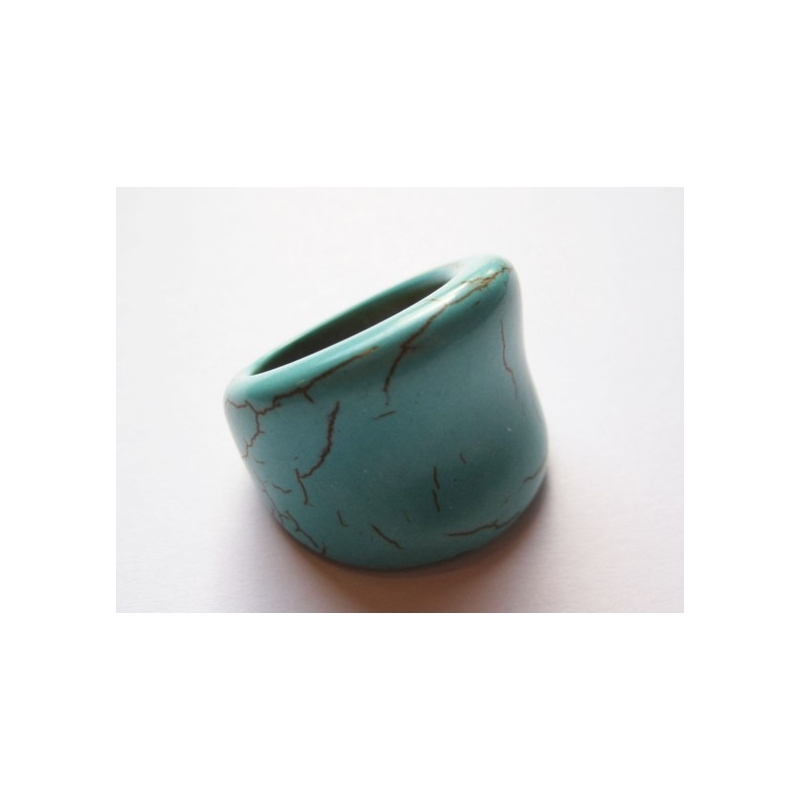 Ring af turkis. Ringen får kun med en diameter på ca. 19 mm. (det er ringens indvendige mål) Ringstørrelse: Højde - ca. 33 mm. Bredde - ca. 30 mm. Dybde (top) - ca. 22 mm. Dybde (bund) - ca. 7 mm. Prisen er for 1 stk.