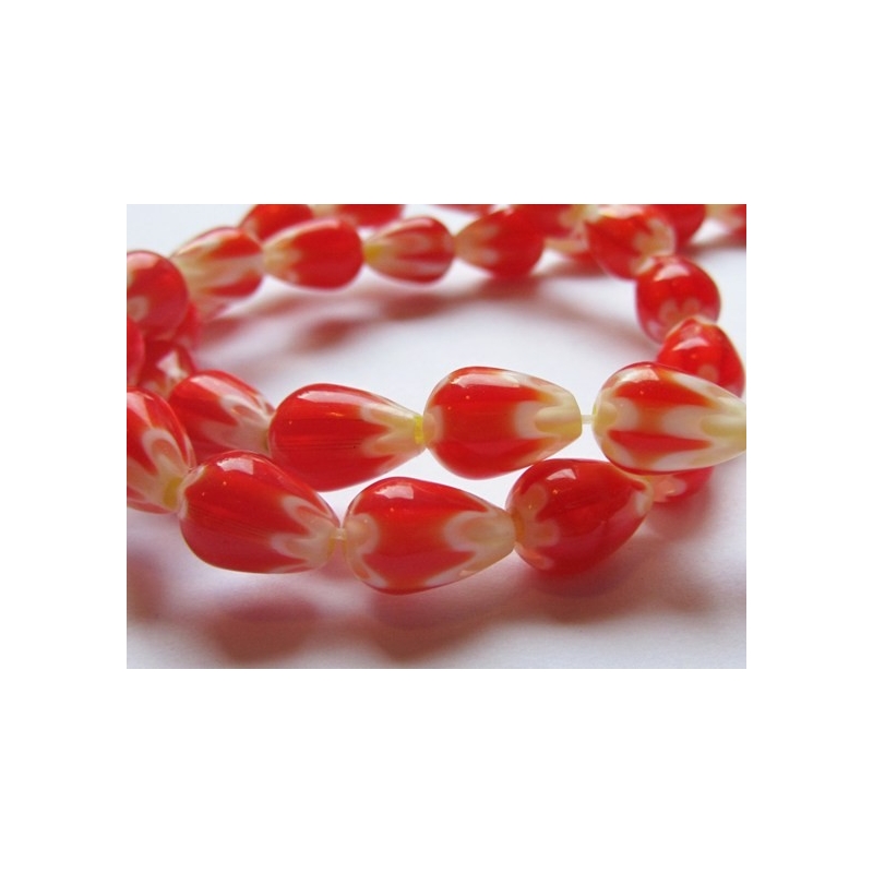 Dråbeformede glasperler - røde. Str. ca. 8 x 11 mm. Hulstr. ca. 1 mm. Antal på streng: ca. 35 stk. Prisen er for 1 streng.