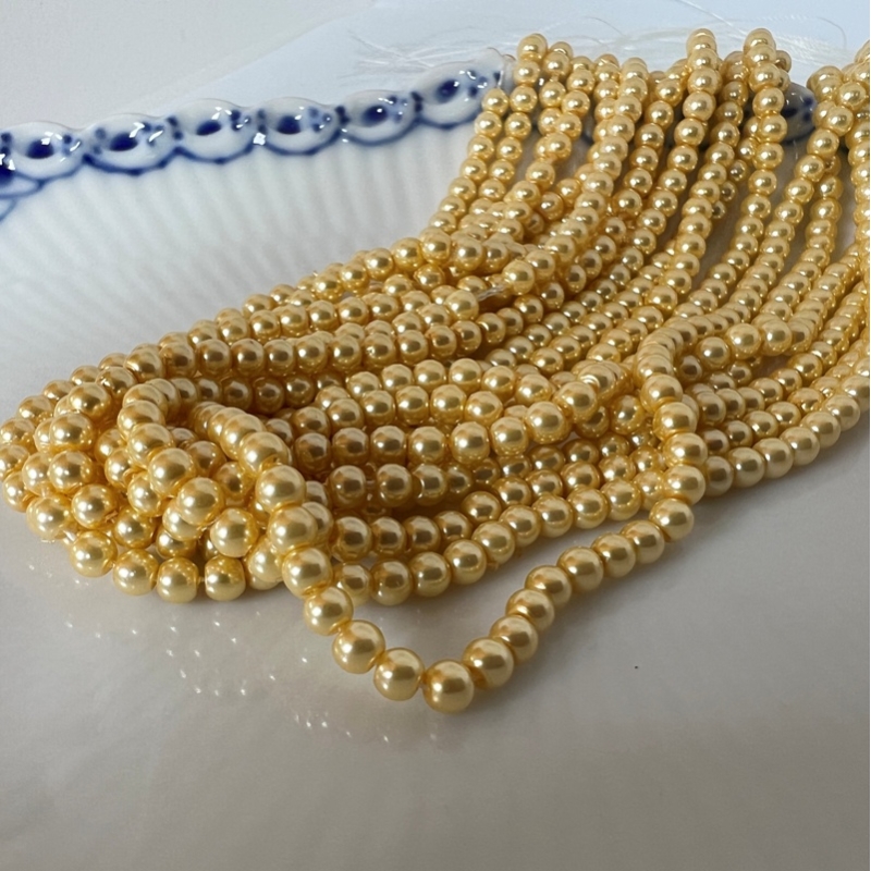 Runde glasperler - creme farvet. Str. ca. 4 mm. Hul str. ca. 0,8 mm. Antal på streng ca. 100 stk. Prisen er for 1 streng