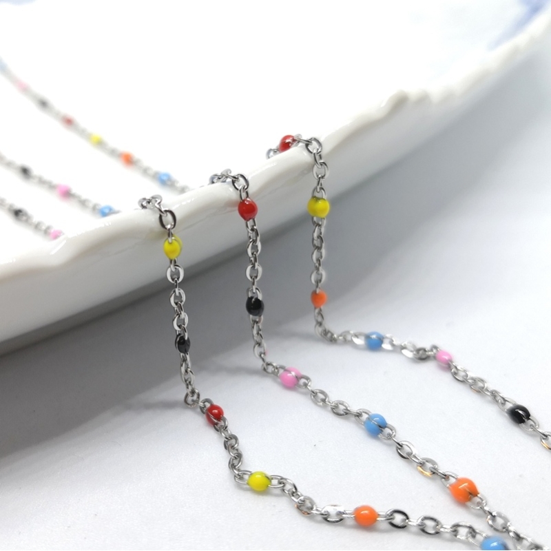 Fin kæde med små emaljeperler i skiftende farver - lyserød, blå, orange, gul, rød og sort. Kæden er en ankerkæde af forgyldt rustfrit stål. Kan bruges som halskæde, armbånd, vedhænd til øreringe etc. Kæde str. ca. 2 x 1,5 mm. Trådtykkelse ca. 0,4 mm. Prisen er for 50 cm. Ved køb af mere end et stk. - leveres kæden i et helt stykke.