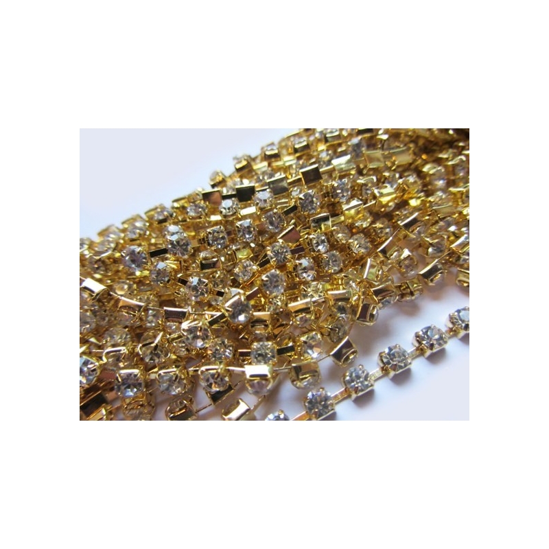 Rhinstenskæde - guldfarvet. Str. ca. 2 x 2 mm. og ca. 2 mm. mellem stenene. Prisen er for 1 meter.