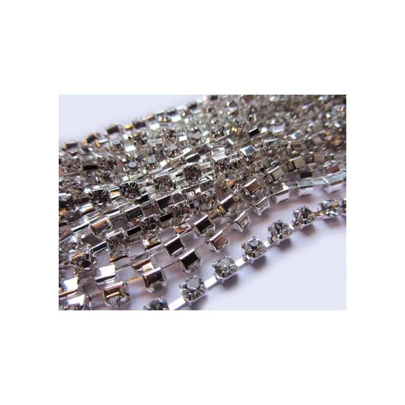 Rhinstenskæde - guldfarvet. Str. ca. 2 x 2 mm. og ca. 2 mm. mellem stenene. Prisen er for 1 meter.