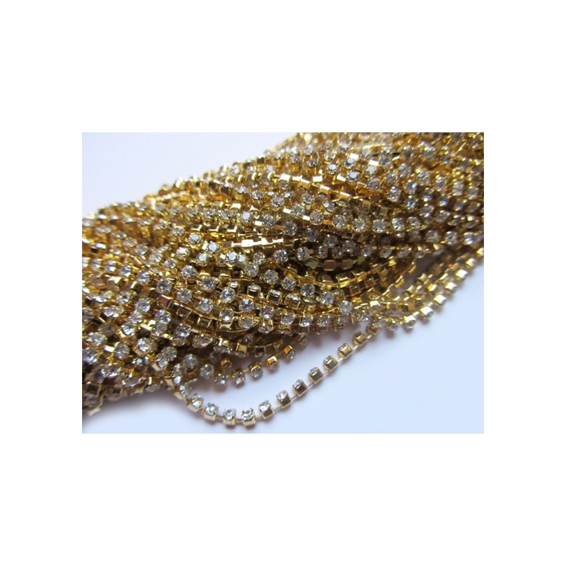 Rhinstenskæde - guldfarvet. Str. ca. 4 x 4 mm. og ca. 3 mm. mellem stenene. Prisen er for 1 meter.