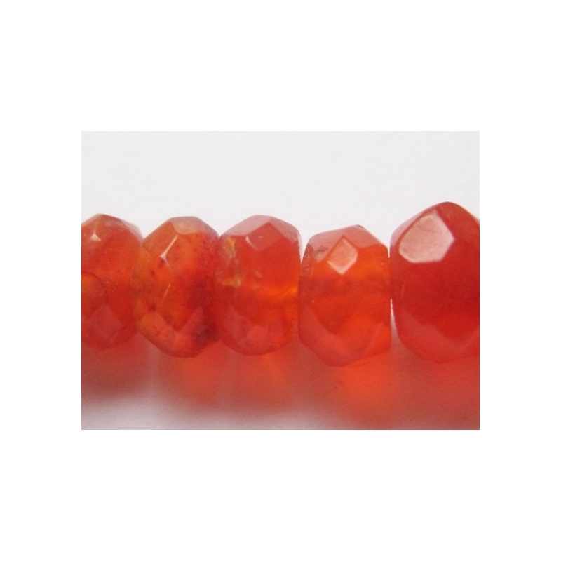 Facetslebne perler af Karneol. Bemærk at de er håndlavede, så de vil derfor ikke være ens. Str.: ca. 2-4 x 4-5 mm. Hul. str.: ca. 0,5 mm. Antal på streng: ca. 125 stk. Prisen er for 1 streng.