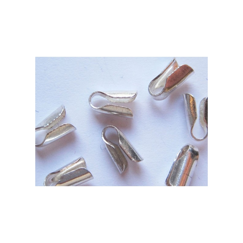 Sølvfarvet knudeskjuler - til silke og nylon tråd. Str. - som på billede: ca. 5 x 8 mm. Passer til en tråd på op til ca. 1 mm. Prisen er for 10 stk.