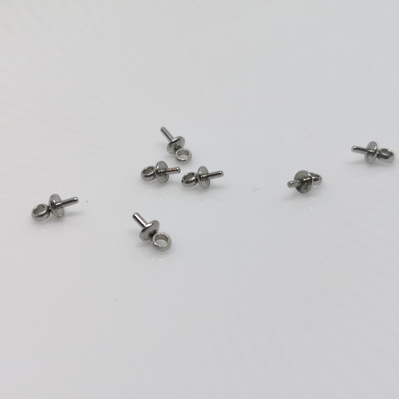 Klemlås til en 1-2 mm. snor/tråd med øje. Str. - som på billede: ca. 6 x 3 mm. Hulstr.: ca. 1 mm. Prisen er for ca. 100 stk.