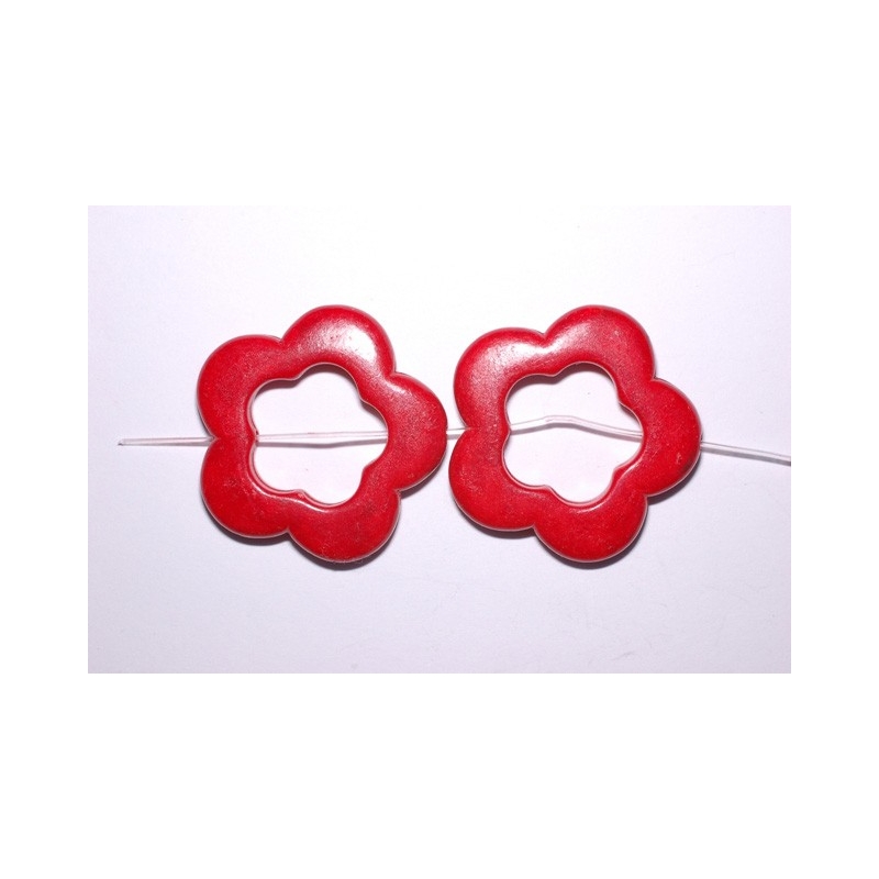 Blomster af rød koral. Str. ca. 33 x 5 mm. Hulstr. ca. 1,2 mm. Antal på streng: 13 stk. Prisen er for 1 streng.