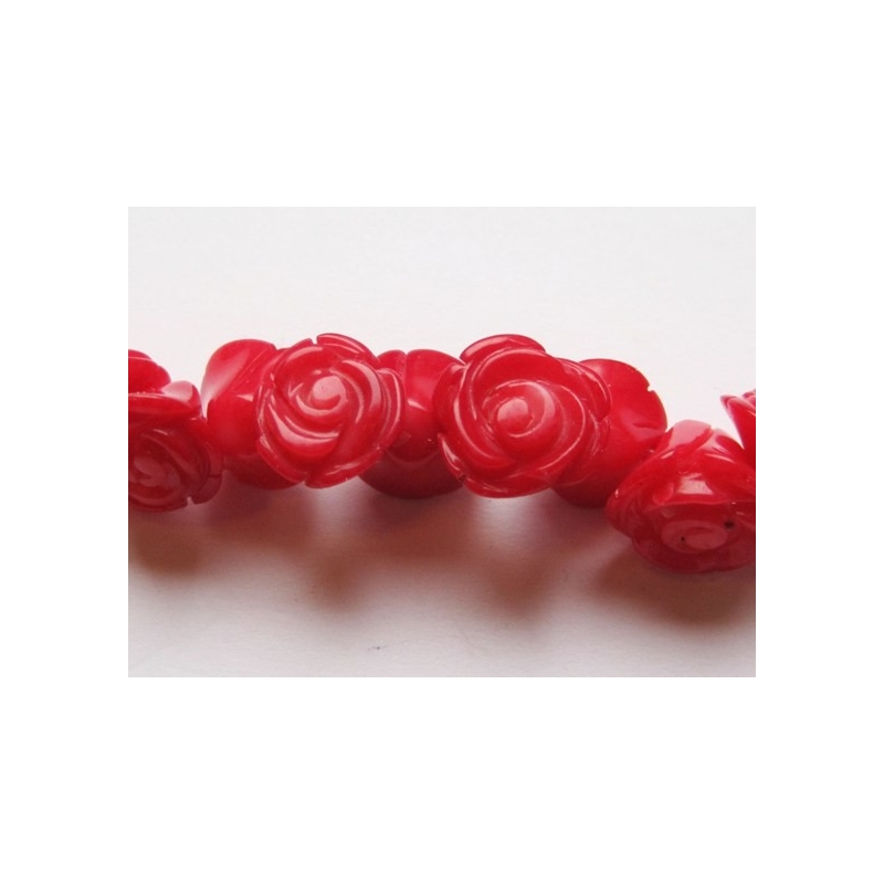 Røde blomster af koral. Str.: ca. 11 x 7 mm. Antal på streng: ca. 70 stk. Prisen er for 1 streng.