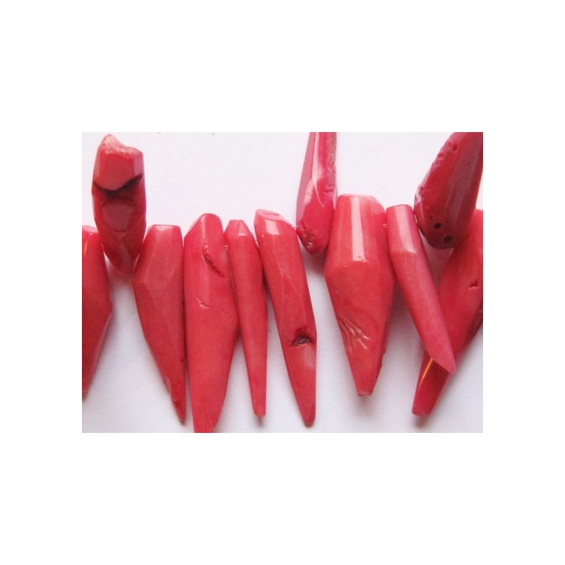 Vedhæng af koral - sideboret. Disse vedhæng er ikke ens, men i forskellige størrelser. Str.: ca. 0,7 - 1,4 x 3,5 - 5,5 cm. Hulstr.: ca. 0,8 mm. Antal på streng: ca. 60 stk. Prisen er for 1 streng.