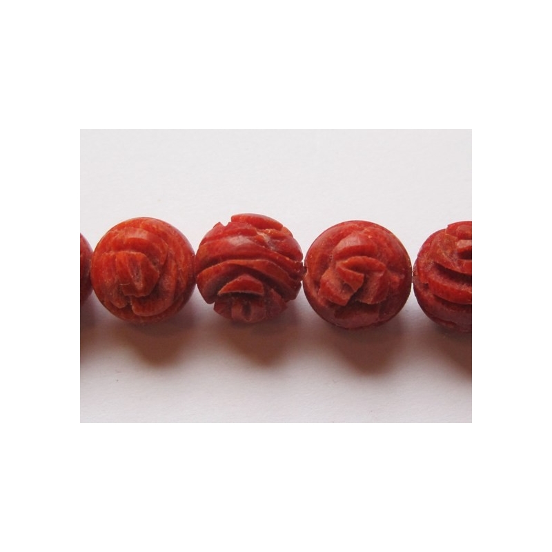 Runde udskårne perler af rød koral. Str. på perler: ca. 11 mm. Hulstr.: ca. 0,9 mm. Antal på streng: ca. 35 stk. Prisen er for 1 streng.