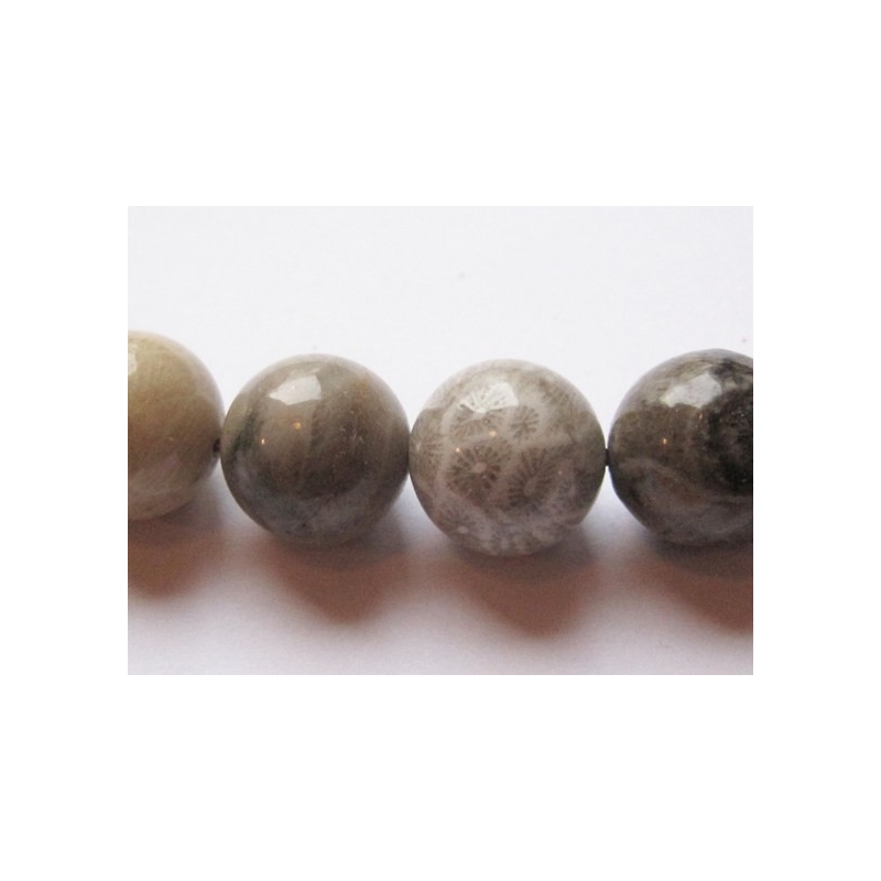 Runde udskårne perler af hvid koral. Str. på perler: ca. 12 mm. Hulstr.: ca. 0,9 mm. Antal på streng: ca. 33 stk. Prisen er for 1 streng.