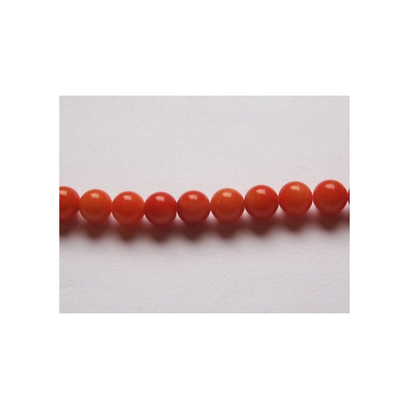 Runde perler af orange koral. Str.: ca. 5 mm. Antal på streng: ca. 85 stk. Prisen er for 1 streng.
