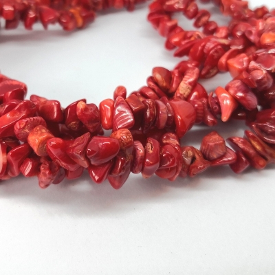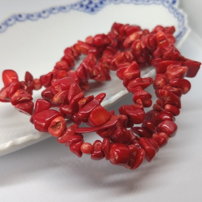 Dråber af presset rød koral. Str.: ca. 8 x 12 mm. Hul str. ca. 1 mm. Antal på streng ca. 32 stk. Prisen er for en streng.