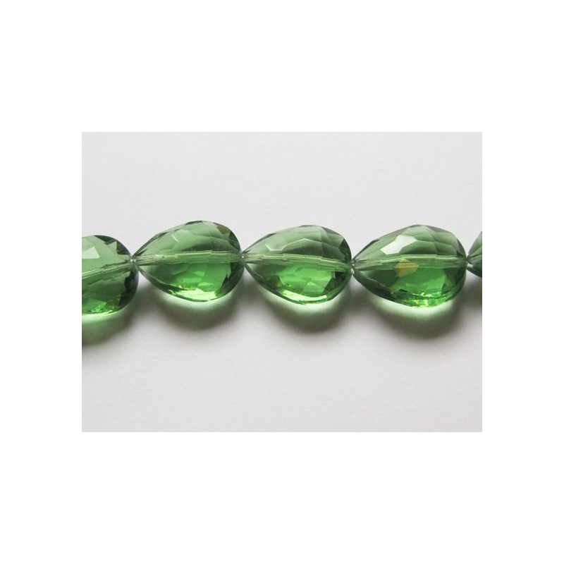 Facetslebne flade krystal dråber. Str. Højde ca. 17 mm. Bredde ca. 12 mm. Tykkelse ca. 8 mm. Hul str. ca. 1 mm. Antal på streng ca. 42 stk. Prisen er for 1 streng.