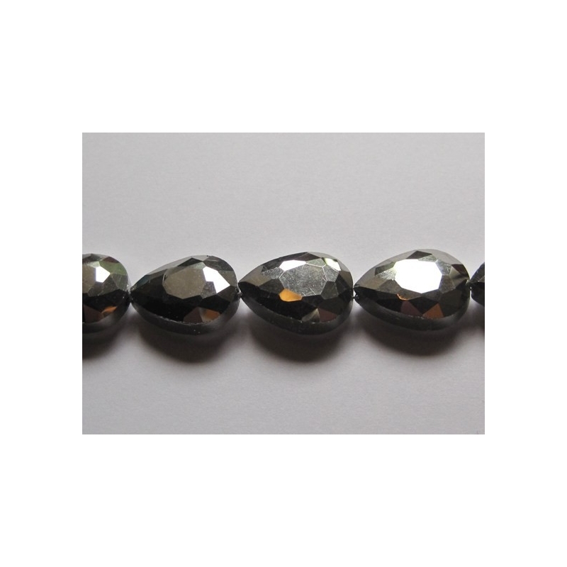 Facetslebne krystal dråber - sølvfarvede. Str.: ca. 12x17 mm. Hulstr.: ca. 1 mm Antal på streng: ca. 20 stk. Prisen er for 1 streng.