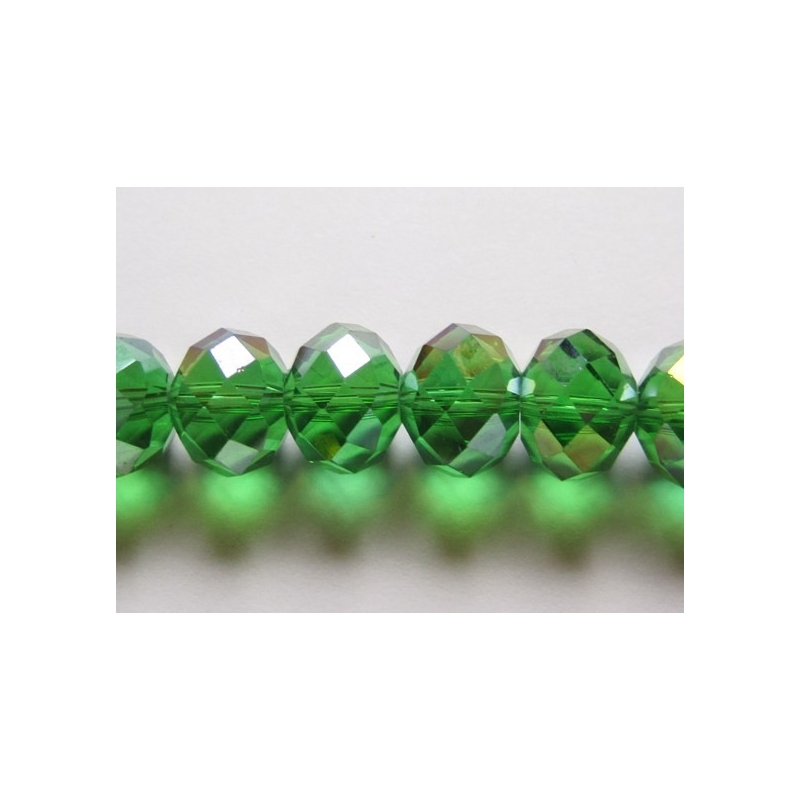 Facetslebne grønne perler af krystal. Str. på perler: ca. 9 x 13 mm. Hulstr.: ca. 1,2 mm. Antal på streng: ca. 30 stk. Prisen er for 1 streng.