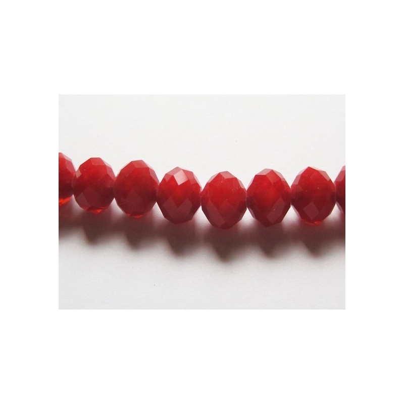 Facetslebne røde perler af krystal. Str. på perler: ca. 9 x 13 mm. Hulstr.: ca. 1,2 mm. antal på streng: ca. 30 stk. Prisen er for 1 streng.
