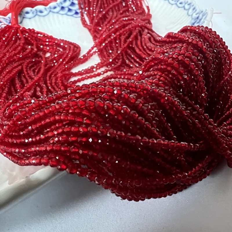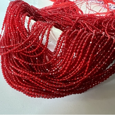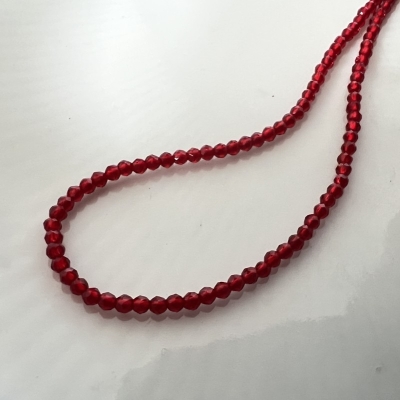 Facetslebne røde perler af krystal. Str. på perler: ca. 9 x 13 mm. Hulstr.: ca. 1,2 mm. antal på streng: ca. 30 stk. Prisen er for 1 streng.