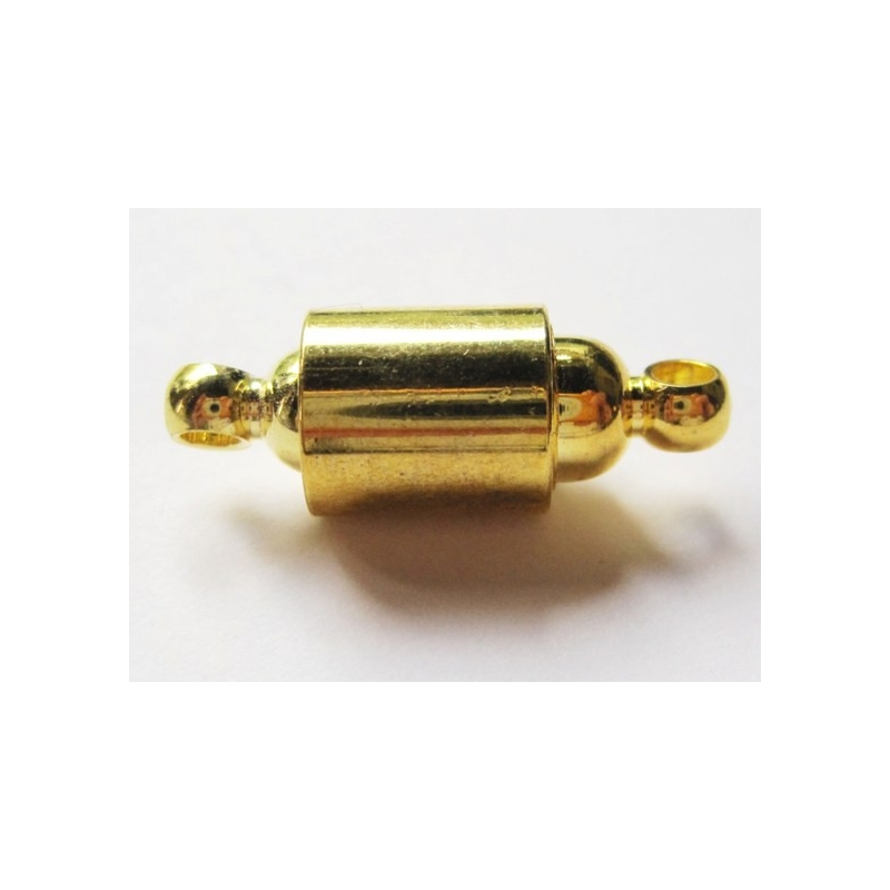 Superstærk guldfarvet magnetlås - med hul igennem midten. Magneten er stærk nok til at holde en større perlekæde !! Magneten monteres ved trække sin tråd igennem magnetens lille hul, hvorefter der laves et par knuder, der virker som lås og samtidig gemmes tråden i magnetens store hul. Udvendigt mål: ca. 11 x 6 mm. Huldiameter: ca. 1 mm. Prisen er pr. sæt.