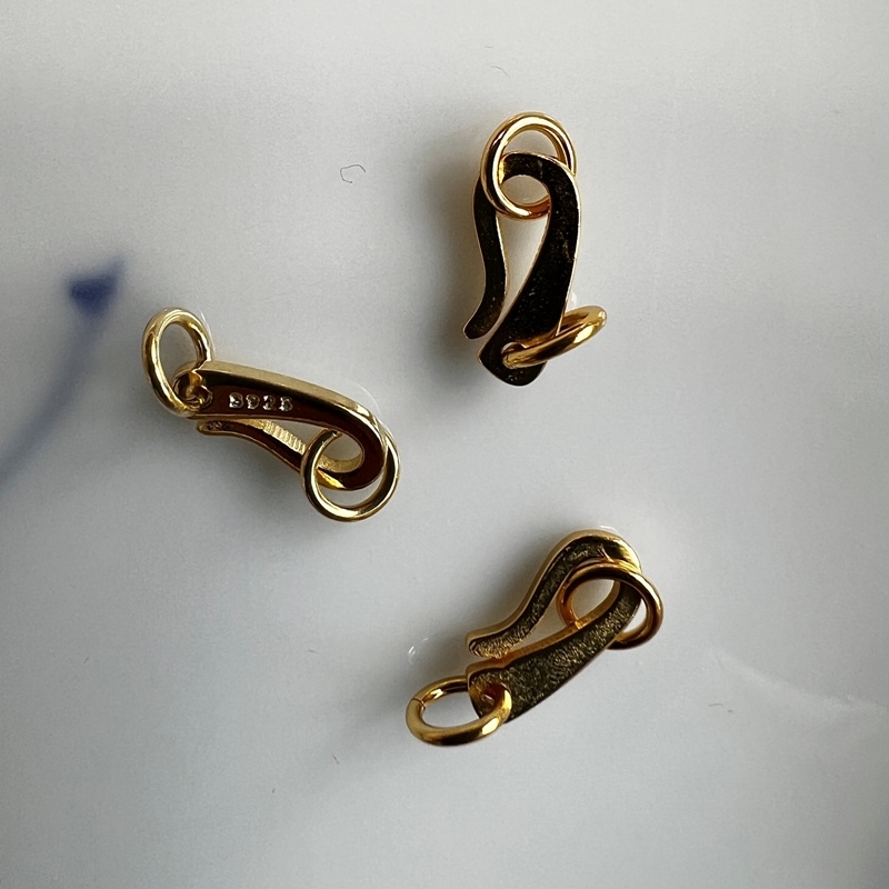 S-lås af forgyldt sterling sølv. Str.: ca. 18 x 7 mm. Trådtykkelse: ca. 1-3 mm. Prisen er pr. stk.