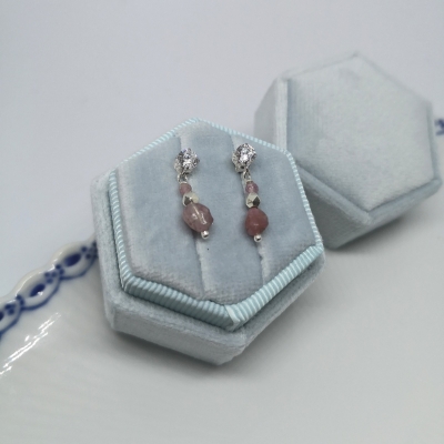 Ørestikkere med grabbeindfatning af forgyldt sterling sølv med sten af rosa quartz. Str. på pind: ca. 10 x 1 mm. Str. på sten: ca. 7 x 7 mm. Prisen er for 1 par.