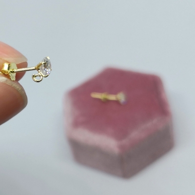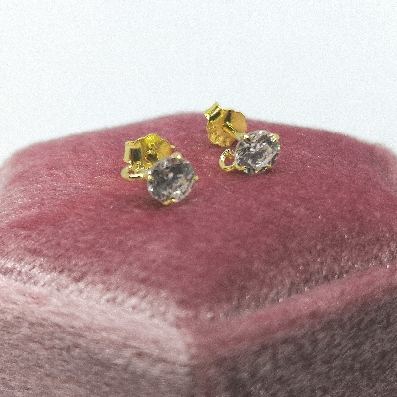 Ørestikkere med zirconia samt øje til vedhæng. Ørestikkerne er af forgyldt messing. Pinden er forgyldt sterling sølv. Der følger ikke bagstopper med, men der er vedlagt et par plast stoppere. Str. ca. 7 x 8 mm. Hul str. i øje ca. 1,2 mm. Tykkelse/længde på pind - 0,9 mm. / 13 mm. Prisen er for 1 par.