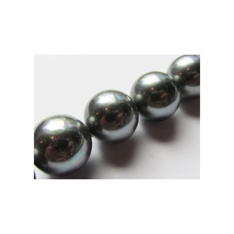 Runde perler af sølvfarvet perlemor. Str. : ca. 12 mm. Hulstr.: ca. 0,8 mm. Antal på streng: ca. 33 stk. Prisen er for 1 streng.
