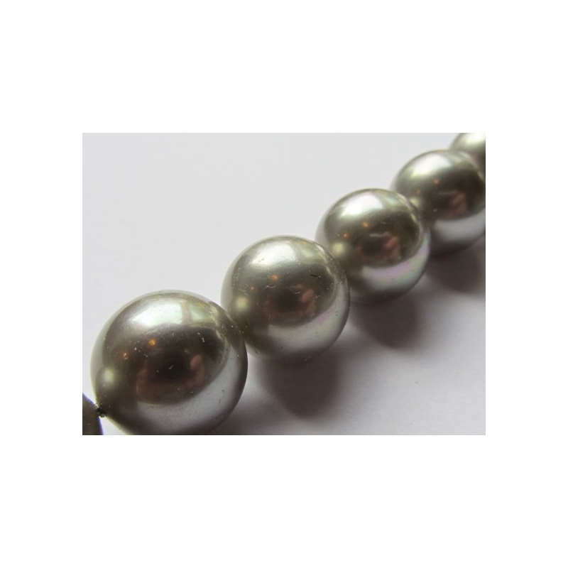 Runde perler af sølvfarvet perlemor. Str. : ca. 16 mm. Hulstr.: ca. 0,8 mm. Prisen er for 2 stk.