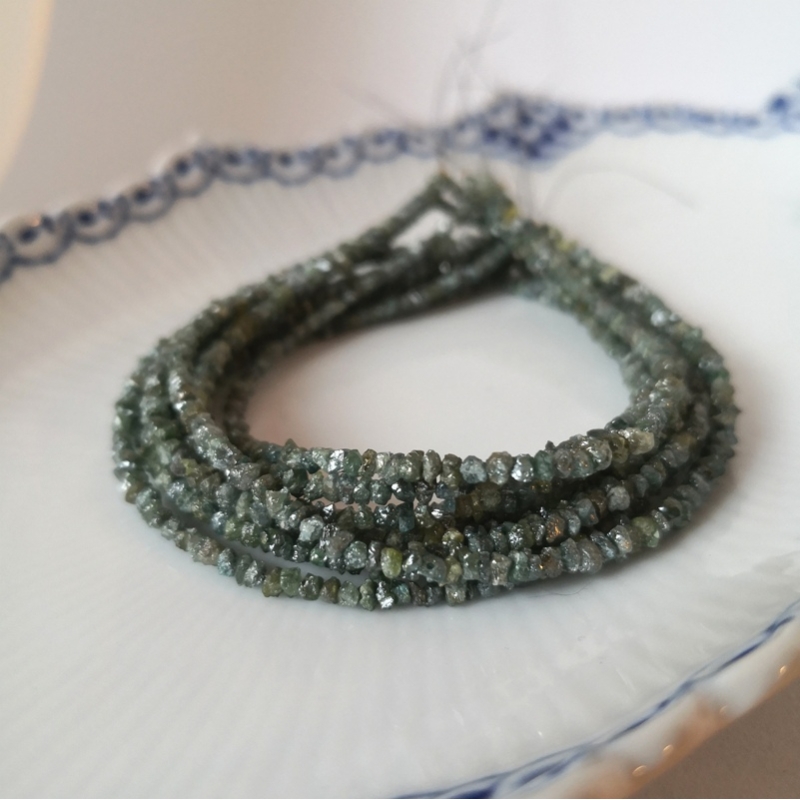 Ægte rådiamanter - lysegrå. Str. ca. 2-2,5 x 1,5-2 mm. Hul str. ca. 0,3 mm. Antal på streng ca. 100 stk. Længden på en streng ca. 17 cm. Prisen er for 1 streng.