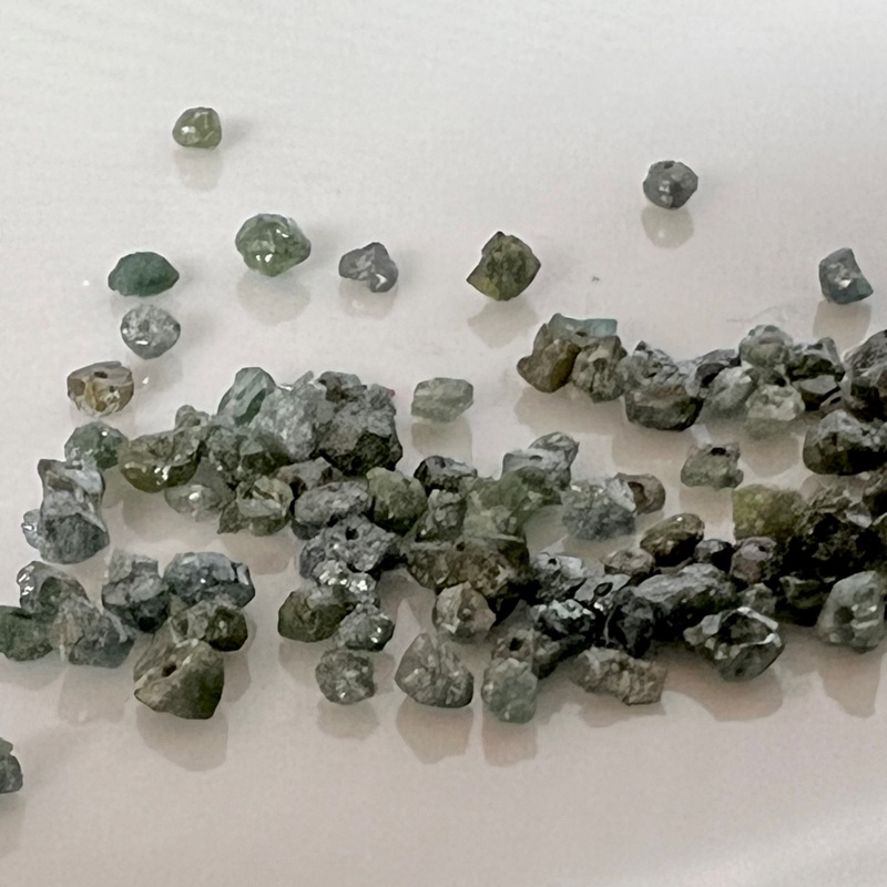 Ægte rådiamanter - grønne. Str. ca. 2-2,6 x 1,5-2 mm. Hul str. ca. 0,3 mm. Antal på streng ca. 110. Længden på en streng ca. 20 cm. Prisen er for 1 streng
