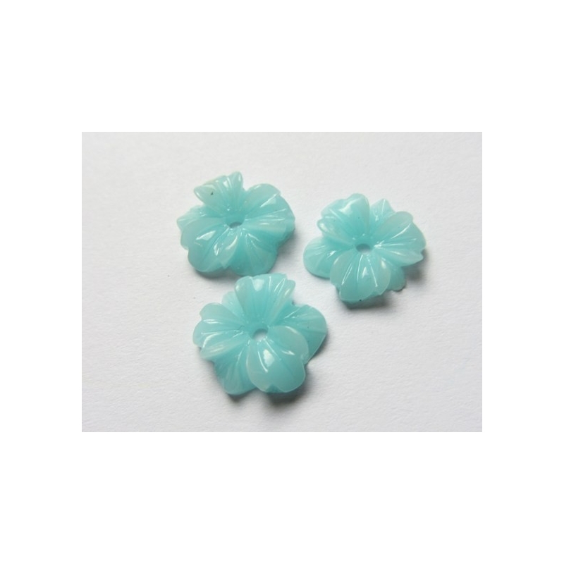 Lyseblå resin blomst. Blomsten er uden hul. Kan f.eks. limes på en flad sølv eller guldfarvet messingplade med øje, og kan herefter bruges som vedhæng. Du finder disse plader i denne varegruppe. Str. på blomst: ca. 11 x 5 mm. Prisen er for 4 stk.