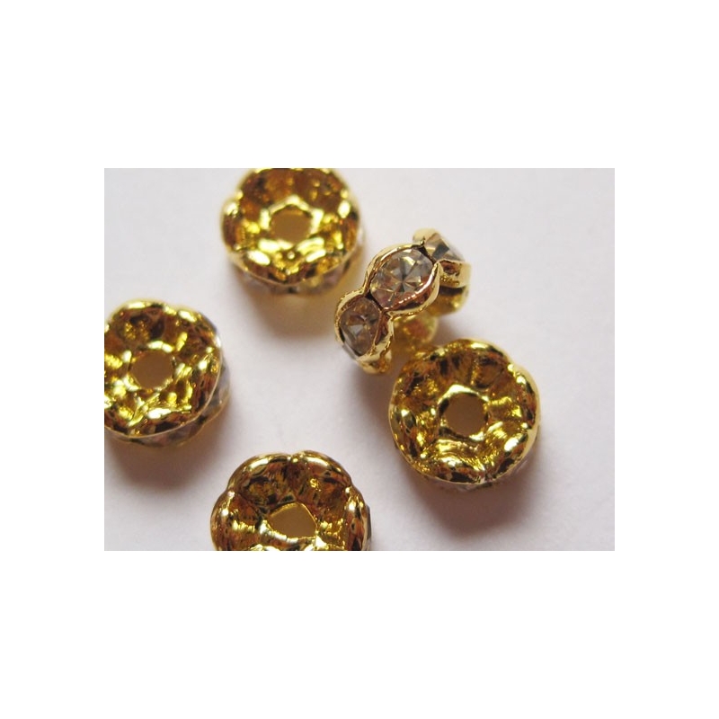 Guldfarvede rondeller med klare rhinestone sten. Str. ca. 10 x 4 mm. Hulstr.: ca. 2 mm. Prisen er for 10 stk.